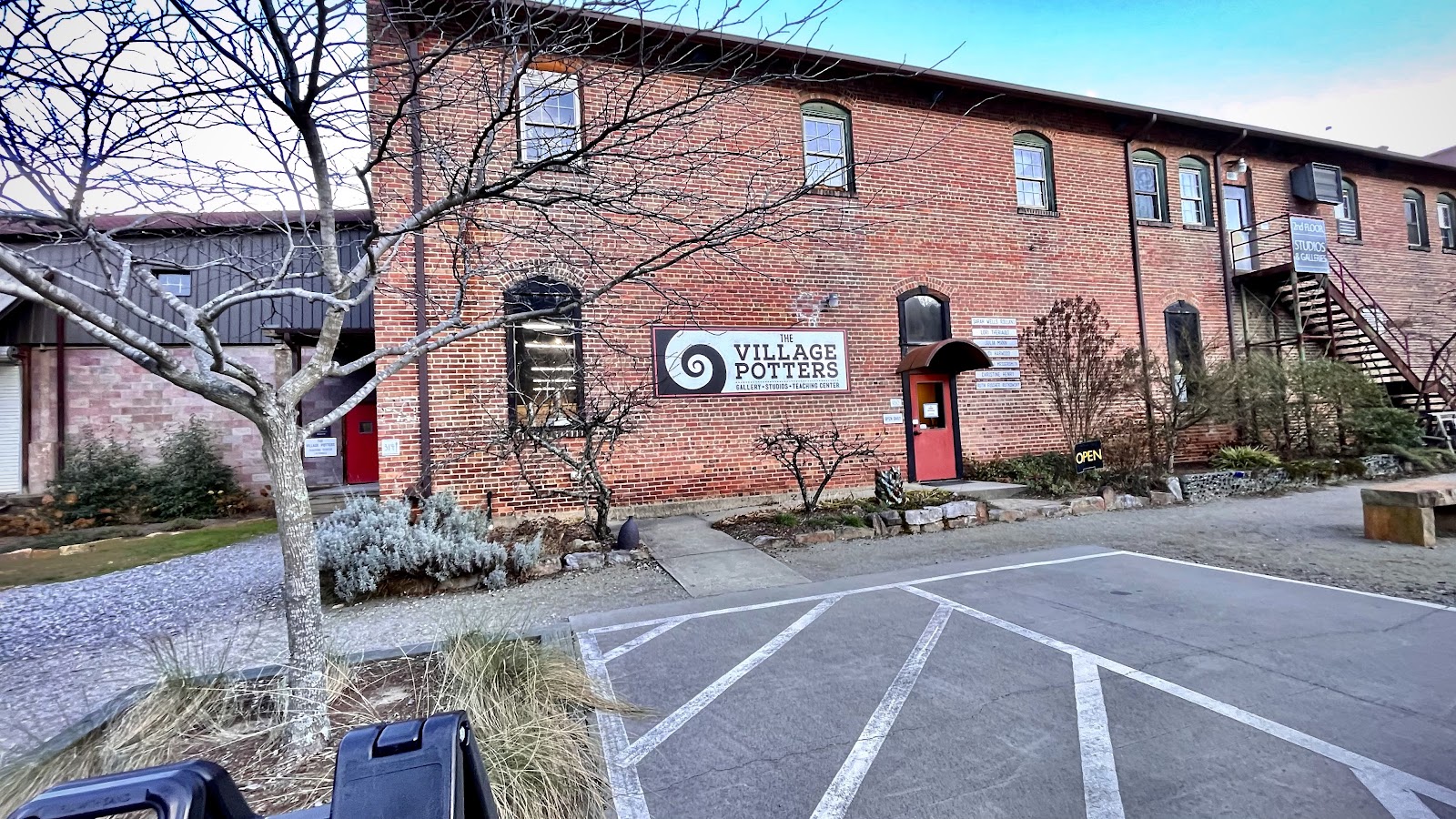 Industrial working artists’ studios with crafts & fine art for sale, plus a serene outdoor area.