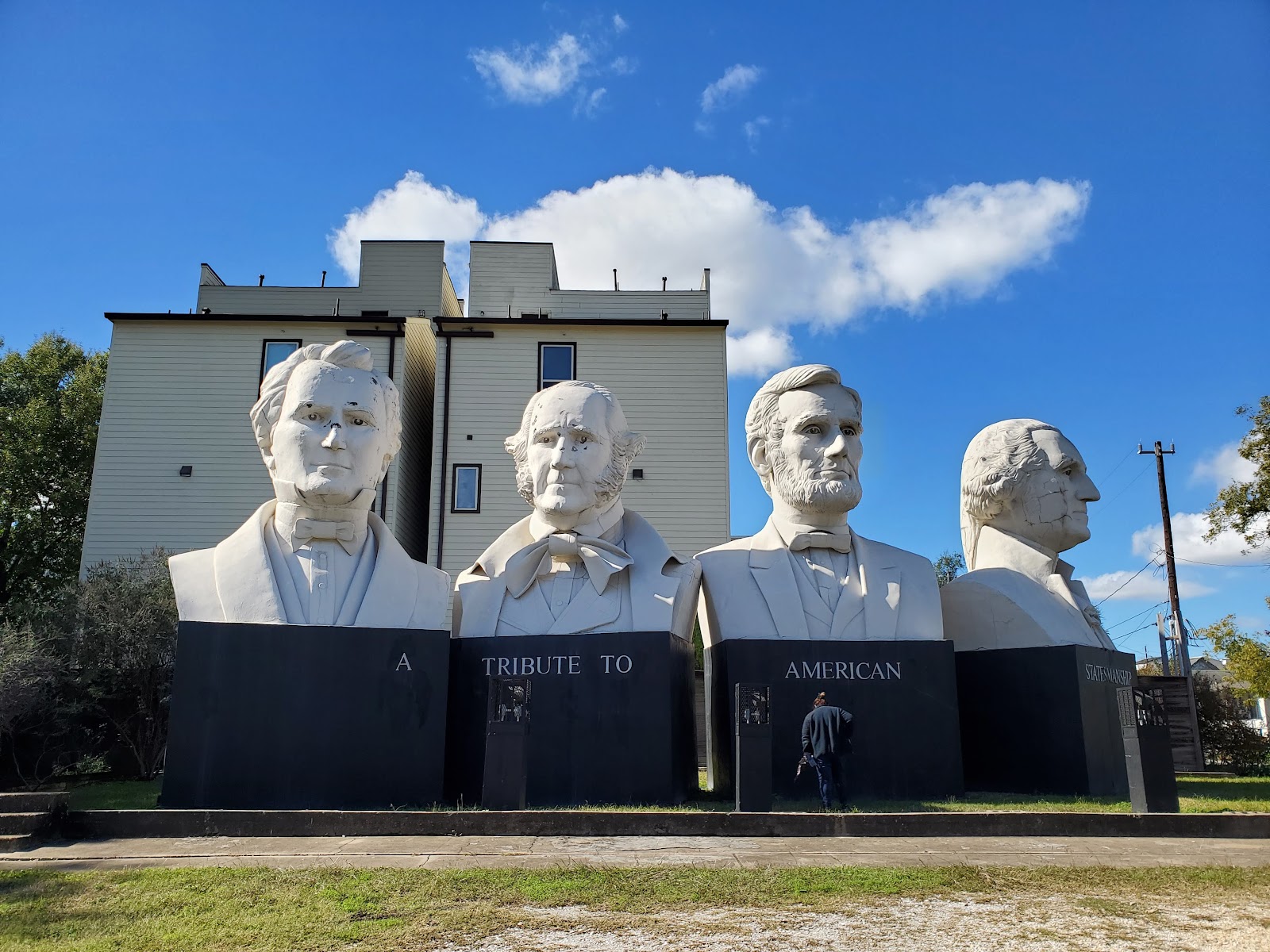 Small, freeway-side park holding outsize busts of U.S. presidents & Texas statesmen.